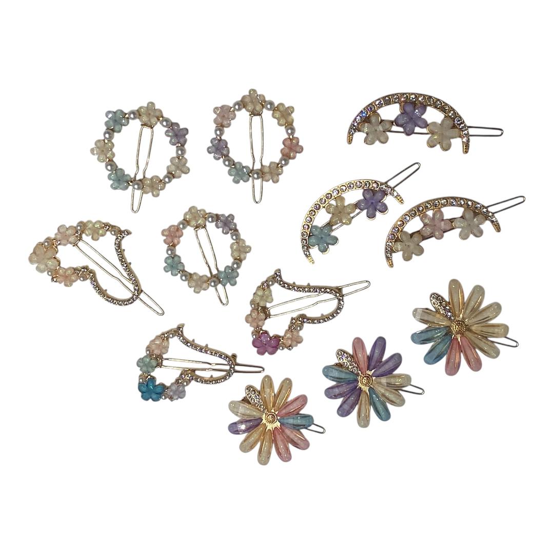 این گیره‌های مو با طراحی ظریف و فانتزی، انتخابی شیک و خاص برای استایل‌های روزمره و مجلسی هستن. جنس کاملاً فلزی با کیفیت بالا دارن و روی هر مدل، نگین‌های رنگی متنوع کار شده که جلوه‌ای چشم‌نواز و دخترانه به موها می‌ده.